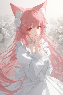 1girl, solo, long hair, looking at viewer, bangs, hair ornament, red eyes, long sleeves, dress, bow, animal ears, very long hair, pink hair, flower, parted lips, choker, puffy sleeves, hair flower, white dress, animal ear fluff, white flower, index finger raised, finger to mouth, white rose, chess piece, shushing