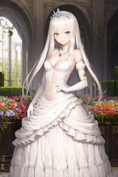 <lora:艺术家_tony taka2-000009:0.8>, masterpiece, 1girl, anime face, cute girl, ultra detailed, best quality, 14-year-old girl, blue eyes, ((goddess)), (((princess))), embodies the goddess of art and beauty, an endearing smile, small breast, long hair, silver hair, opened eyes, detailed, (aristocratic dress), white dress, princess dress, ((frill)), decorated with ornate embellishments, tiara, jewelled necklace, medieval europe environment, walking, (floral garden), (flower garden)