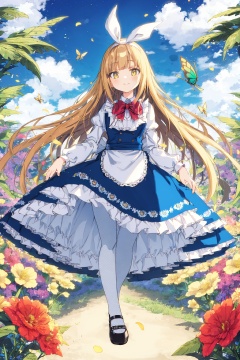 <lora:艺术家_ゾイルン1:0.6>, (((masterpiece))),best quality, illustration,(colorful),(depth of field:1.12), (focus on girl),((alice)),alice in wonderland, solo,cute face,(delicate detailed face),front view,(full body),long blonde floating hair, blunt_bangs,((white and blue frilled dress)), (white pantyhose),(long sleeves),(juliet_sleeves), (puffy sleeves),blue large bow,sleeves past wrists, sleeves past fingers,scenery,ray tracing,wonderland,extreme detailed effect,(many detailed yellow and white flowers),Butterfly