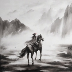 Wuxia a serene figure in traditional Chinese attire seated on a horse holding a staff wearing a red hat and flowing robe surrounded by misty mountains ethereal and mystical atmosphere black and white color palette soft focus calm and contemplative mood full-body shot full back view wide-angle shot slight tilted angle calm water surface., ink painting, a drawing of a woman holding a horse with a man on it's back, 1girl, long hair, 1boy, hat, monochrome, cape, bird, animal, letterboxed, riding, horse, horseback riding, spot color