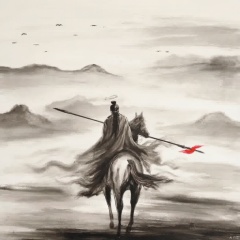 Wuxia a warrior on a horse misty landscape traditional Chinese attire long flowing robes holding a long sword red arrow serene expression distant mountains mist distant birds overcast sky black and white tones ethereal and mystical atmosphere., ink painting, a man riding a horse with a spear in his hand and a flag in his hand on the back, solo, long hair, 1boy, holding, monochrome, weapon, greyscale, male focus, from behind, cape, holding weapon, helmet, letterboxed, polearm, spear, facing away, riding, holding polearm, horse, horseback riding, very long hair, outdoors, armor, bird, spot color