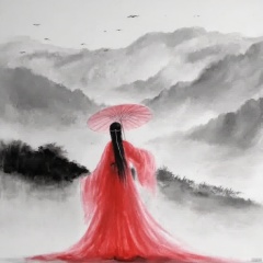 Inspired by traditional Chinese painting a serene figure in traditional Chinese attire Tang dynasty long black hair flowing red robe holding a pink paper umbrella standing in a mountainous landscape misty mountains in the background birds flying in the sky soft lighting ethereal and contemplative mood muted colors delicate and elegant composition., ink painting, a woman in a red dress holding an umbrella in the rain with mountains in the background in black and white, 1girl, solo, long hair, black hair, long sleeves, very long hair, standing, wide sleeves, from behind, bird, umbrella, chinese clothes, red dress, letterboxed, mountain, oil-paper umbrella, grey sky