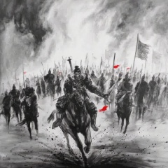 Wuxia a warrior from the ancient dynasty seated on a black horse holding a sword and a red arrow surrounded by a group of warriors holding flags and other weapons all in black and white dramatic and intense atmosphere intense and focused full-body shot low-angle shot dramatic lighting intense gaze historical and historical elements., ink painting, a painting of a man on a horse with a sword in his hand and a group of men on horses in the background, 1boy, holding, monochrome, weapon, greyscale, male focus, sword, holding weapon, armor, helmet, polearm, spear, riding, holding polearm, horse, horseback riding, letterboxed, spot color