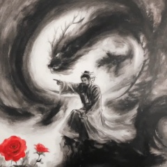 Wuxia traditional Chinese painting style serene figure in traditional attire seated on a rock holding a sword surrounded by a swirling dragon with a red rose in the foreground dark and cloudy background ethereal and mystical atmosphere intricate details flowing robes poised and contemplative expression ancient dynasty-inspired., ink painting, A man points forward with a dragon behind him, solo, long hair, long sleeves, 1boy, hat, monochrome, ponytail, male focus, wide sleeves, from side, chinese clothes, pointing, robe, dragon, antlers, eastern dragon, facial hair, beard, spot color