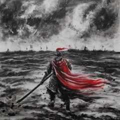 Photograph a warrior in armor stands in a turbulent sea holding a red flag and a sword with a black handle wearing a chain with a pendant dark and ominous mood dark cloudy sky waves and distant ships in the distance and the red flag billowing in the wind., ink painting, a painting of a man with a sword and a red cape standing in the water with a cloudy sky behind him, solo, 1boy, holding, standing, weapon, male focus, from behind, cape, holding weapon, armor, helmet, polearm, spot color, spear, red cape, holding polearm, weapon over shoulder, floating cape, sword, katana