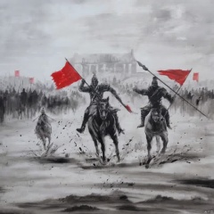 Photograph two men on horseback one in traditional Chinese attire holding red flags one with a sword and one with an arrow both of them are in a battle with a large crowd of people in the background and a building with a red roof in the distance all of the painting is black and white and the sky is cloudy., ink painting, a painting of two men on horses chasing a horse in the snow with a building in the background and a person on a horse in the foreground, holding, monochrome, weapon, male focus, multiple boys, sword, 2boys, cape, holding weapon, armor, holding sword, helmet, polearm, spot color, spear, battle, riding, holding polearm, horse, horseback riding, outdoors, letterboxed, flag, grey sky