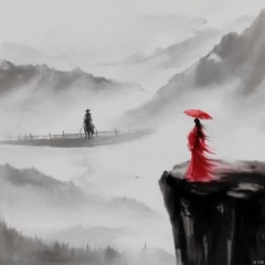 Wuxia a woman in red dress holding a red umbrella standing on a cliff looking over a misty mountain holding her head towards a figure on a horse wearing a dark hat dark cloak holding long swords misty mountains in the background ethereal and serene atmosphere soft lighting egyption of natural beauty and mystery., ink painting, a painting of a person riding a horse across a bridge over a mountain range with a person on a horse, 1girl, long hair, multiple girls, holding, standing, outdoors, japanese clothes, kimono, water, umbrella, letterboxed, scenery, mountain, oil-paper umbrella, bridge, fog, 1boy, weapon, sword, grey sky