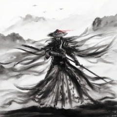 Wuxia a warrior in traditional Chinese armor dark and ominous mood standing in a mountainous landscape holding a sword long flowing wings wearing a black helmet with a red feather dark background misty mountains distant birds ethereal and somber atmosphere full-body shot dramatic and dramatic composition dark dark colors poised and ready for battle., ink painting, a man with a long hair and a hat on holding a sword in his hand and a wind blowing behind him, solo, 1boy, hat, holding, standing, monochrome, weapon, male focus, sword, holding weapon, armor, bird, holding sword, katana, letterboxed, outdoors, cape, helmet, spot color