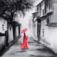 Traditional Chinese painting style a woman in a red traditional robe walks down a narrow alleyway holding a red umbrella and a black staff with long black hair holding red lanterns and wearing a black headdress and holding a black scroll and the walls of the alley are painted with calligraphy and trees in the background all of which are dark and muted overcast lighting., ink painting, a painting of a woman in a red dress holding an umbrella on a street with buildings and a horse, 1girl, solo, japanese clothes, kimono, tree, umbrella, letterboxed, scenery, lantern, stairs, oil-paper umbrella, torii, shrine, 1boy, spot color, architecture, east asian architecture