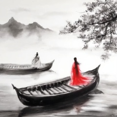 Wuxia serene landscape two figures in traditional Chinese attire one in red flowing robes the other in white flowing robes with black hair standing on a large wooden boat surrounded by misty mountains soft lighting ethereal and mystical mood intricate details delicate brushstrokes soft shadows calm and contemplative atmosphere., ink painting, a painting of a woman in a red dress walking across a bridge with a man sitting on it and a tree in the background, 1girl, long hair, black hair, 1boy, sitting, tree, chinese clothes, spot color, branch, multiple girls, 2girls, japanese clothes, letterboxed, wind, watercraft, architecture, east asian architecture