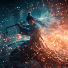 Wuxia warrior in traditional Chinese attire dynamic pose with a sword intense expression intense gaze intense lighting dynamic dynamic red and blue hues ancient Chinese buildings in the background intense and focused atmosphere dynamic and powerful dynamic composition dynamic movement historical and historical ambiance., male, aura, realistic movie stills, flame, holding sword, war, ancient chinese martial arts style, dynamic, spark, male focus, japanese clothes, letterboxed, black hair, hakama, architecture, fighting stance, topknot, east asian architecture