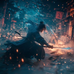 Wuxia warrior in traditional Chinese attire dynamic pose with swords intense expression intense gaze intense lighting dynamic dynamic intense cityscape intense atmosphere intense shadows dynamic movement dark and intense mood high contrast dynamic and focused dynamic composition dynamic lighting intense and focused., female, solo, realistic movie stills, ancient chinese martial arts style, holding sword, fighting stance, spark, dynamic, flame, war, aura, ponytail, holding, long hair, black hair, japanese clothes, blurry, dutch angle, sheath, night, looking at viewer