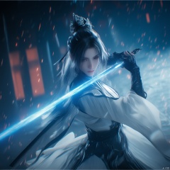 Wuxia female warrior in a dark city at night holding a blue sword intense expression long flowing hair white armor black flowing robes dramatic lighting blurred cityscape with tall buildings and red lanterns intense and focused mood dynamic pose low-angle shot dramatic and dramatic atmosphere., holding light-sword, weapon, 1girl, particle effects, spark, holding ice-sword, sword, solo, holding sword, holding, holding weapon, night, blurry, glowing
