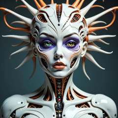 ARob, A hyper-realistic portrait of a stunning supermodel, Robot face, made of machine parts. The image blends futuristic and traditional elements with a neo mode, avant-garde style, characterized by delicate and sleek lines, vibrant colors, and exquisite details. The model’s eyes captivate with complex colored irises, while her unique, crazy hairstyle adds to the surreal and mysterious charm. The overall composition is symmetrical and fluid, with an ethereal and timeless aura.
