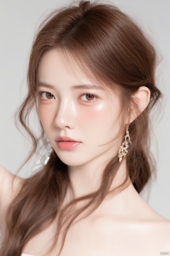 GX_girl,1girl,best quality, masterpiece, raw photo of a female in white dress, close up face, brown hair, fashion accessories, looking at viewer, indoor, day time, professional photo, high contrast exposure, soft bokeh, high key light, hard shadow, soft bokeh, simple background, white background,