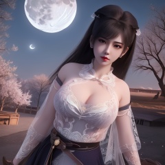 <lora:799-DA-神墓-楚钰:0.8>, (,1girl, ,best quality, ),,  ,ultra realistic 8k cg, ,masterpiece, (( , )),, ,fiction,mole,,      ,(cleavage),,  (),  ,see-through, lace, (((, solo, moon, , bare_tree, )))(cleavage),,