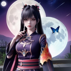 <lora:799-DA-神墓-楚钰:0.8>, 1girl, solo, butterfly, bug, kochou shinobu, demon slayer uniform, butterfly hair ornament, , , hair ornament, moon, multicolored hair, katana, full moon, long sleeves,  , sheath, haori, night, closed mouth, unsheathed, sky,  , belt, blue butterfly, jacket, gradient hair, black jacket, wide sleeves