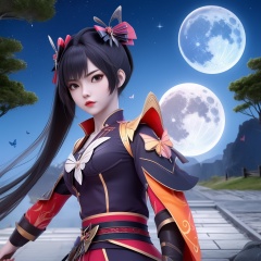 <lora:799-DA-神墓-楚钰:0.8>, 1girl, solo, butterfly, bug, kochou shinobu, demon slayer uniform, butterfly hair ornament, , , hair ornament, moon, multicolored hair, katana, full moon, long sleeves,  , sheath, haori, night, closed mouth, unsheathed, sky,  , belt, blue butterfly, jacket, gradient hair, black jacket, wide sleeves