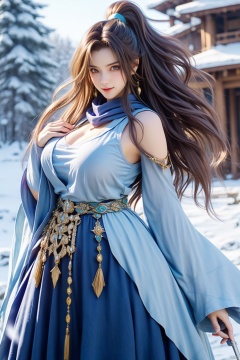 1girl solo long hair breasts looking at viewer smile red eyes dress holding jewelry medium breasts ponytail red hair detached sleeves wide sleeves necklace scarf white dress high ponytail staff white scarf snowflakes