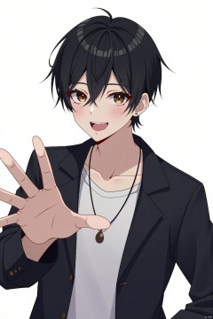 solo, looking at viewer, smile, short hair, open mouth, simple background, shirt, black hair, long sleeves, 1boy, white background, brown eyes, jewelry, jacket, upper body, male focus, earrings, necklace, black jacket, piercing, ear piercing,hand up, hand focus