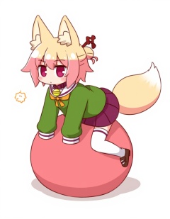 <lora:flux-test-loraqkv:1.2>,artist_kemomimi-chan_\(naga_u\),1girl, animal_ear_fluff, animal_ears, bell, blonde_hair, blush, brown_collar, brown_footwear, closed_mouth, collar, commentary_request, fox_ears, fox_girl, fox_tail, full_body, green_shirt, hair_between_eyes, hair_bun, hair_ornament, jingle_bell, kemomimi-chan_\(naga_u\), long_sleeves, lying, naga_u, neck_bell, on_back, original, pleated_skirt, purple_skirt, red_eyes, ribbon-trimmed_legwear, ribbon_trim, sailor_collar, sandals, shadow, shirt, single_hair_bun, skirt, sleeves_past_fingers, sleeves_past_wrists, solo, tail, thighhighs, white_background, white_sailor_collar, white_thighhighs, zouri,The image is a digital illustration of a cartoon character with pink hair and big ears. The character is sitting on a large pink ball with its legs stretched out in front of it. It is wearing a green jacket, white pants, and purple shoes. The jacket has a collar and a bow on the left side. The pants have white stripes on the sides and the shoes have a purple stripe on the bottom. The girl has a big smile on her face and is looking off to the side. She has a small bow on her head and is holding a pair of scissors in her right hand. The background is white.