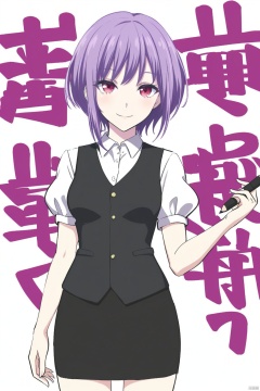 1girl, solo, looking at viewer, smile, short hair, skirt, simple background,, shirt,  white background,  standing, white shirt, short sleeves, black skirt, vest,  pencil skirt,