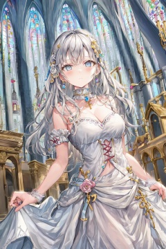 <lora:艺术家_ももこ1:0.8>, (best quality, ultra-detailed), (best illumination, best shadow, an extremely delicate and beautiful), dynamic angle, floating, finely detail, Depth of field, (bloom), (shine), glinting stars, (illustration), (painting), (sketch), (solo), bishoujo, light, best, medieval, ornate, colorful, golden, silver, blue, semstone color, aura, backlight, strong rim light, ray tracing, cinematic angle, adorable, 1girl, holy virgin, expressionless, very long hair, grey hair, (((detailed eyes))), looking at viewer, small breasts, lace-trimmed dress, white dress, white garter straps, tiara, hair ornament, jewelry, ribbon choker, pendant, heaven, churches, behind the virgin is the huge golden church