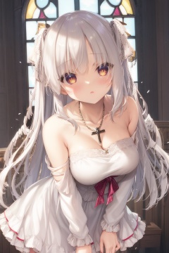 <lora:艺术家_ゆき恵1-000015:1>, (masterpiece, high quality, highres,Highest picture quality), (Master's work),(religion theme :1.25),blurry background,warm light,, (colorful:0.7),(church:1.1), (Flower window glass,tyndall effect:1.05), floating white feathers, (halo:0.95),light on face,(zentangle:1.3),(closed eyes:0.55),eyelashes,(1loi:1.1),angel,angel wings,white wings,huge wings,solo,collarbone,(crucifix:1.1) necklace,ornament,(blush:0.6), (ahoge:1), (makeup:0.5), small breasts, (head tilt:0.75),white dress,see-through, floating in the air, graceful,noble, barefoot, Standing at an angle,(from side:0.8),bare shoulders, shiny skin, shiny hair,long hair, peaceful,(bright pupils:1.1), yellow eyes, white hair, floating hair,cold face