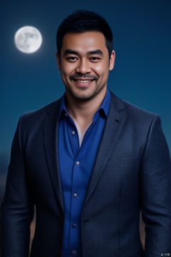 Cinematic film still, 8k resolution, ultrarealistic, (HDR, RAW, DSLR:1), (handsome, sexy blue male demon:1.1), CNMface,CNMaleLiqing,,CNXLliqing,1boy,smile,big moon in the nightsky,galaxy