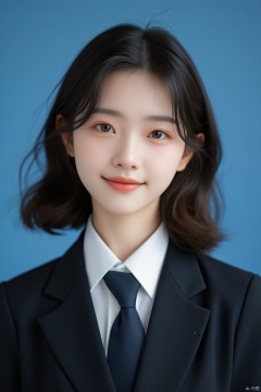 Asian girl,a photograph of a beautiful Asian girl in school uniform,with a solid blue background,in the style of ID photography. She has medium-length hair,a round face shape,and is wearing a white shirt,tie,and black blazer. Her makeup is simple,and she has a gentle,youthful smile with a natural expression,