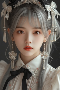 Asian girl,cute girl with silver hair and red eyes,wearing black hair bow tie adorned with white lace bows,in maid outfit,realistic portrait photography,Canon EOS R5,upper body shot,