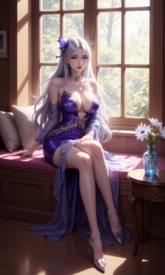 jqzx, . this is a highly detailed digital illustration featuring a young woman with a fair complexion and long, flowing silver hair adorned with a delicate blue butterfly accessory. she has large, expressive blue eyes and a slender, curvaceous physique with prominent breasts. her attire is a form-fitting, off-the-shoulder, deep purple gown with intricate golden embroidery and sheer, translucent sleeves. the gown is elegantly designed with a high neckline and a plunging v-shaped cut that accentuates her cleavage. she wears silver high-heeled shoes that add a touch of sophistication to her ensemble.the setting is a cozy, wooden-framed window seat, bathed in soft, natural light streaming through the large, multi-pane window behind her. the window has a traditional, arched design with wooden frames, allowing ample sunlight to illuminate the room. to her right, a small wooden table holds a delicate, blue glass vase with a single white flower, adding a touch or elegance and simplicity to the scene. the floor is **** of polished wooden planks, contributing to the warm, inviting ambiance of the room.the overall style of the illustration is highly realistic, with meticulous attention to detail in both the subject's appearance and the surrounding environment.