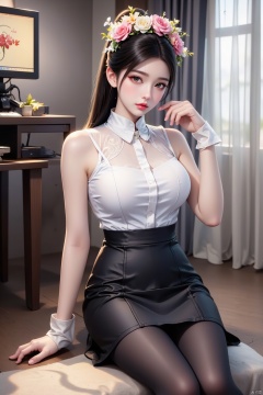 A young Asian woman wearing a flower wreath,1girl, solo, long hair, breasts, looking at viewer, skirt, shirt, black hair, brown eyes, sitting, full body, white shirt, ponytail, pantyhose, sleeveless, indoors, black skirt, black footwear, high heels, lips, wrist cuffs, black pantyhose, sleeveless shirt, crossed legs, high ponytail, pencil skirt, high-waist skirt, monitor