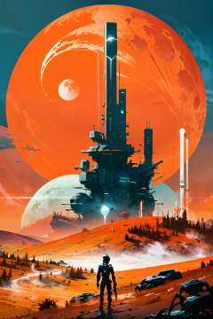 ((masterpiece,best quality)), absurdres,   <lora:Scifi_Environment_Concept_Art:0.8>,   minimalist, game asset, cinematic, movie poster, warm colors, orange theme,    standing, weapon, outdoors, tree, moon, robot, scenery, sun, ambiguous gender, fog