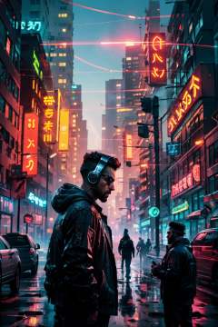 ((masterpiece,best quality)), absurdres, <lora:Scifi_Environment_Concept_Art:0.8>, minimalist, game asset, cinematic, movie poster, warm colors, red theme, purple fog, solo, 1boy, jacket, male focus, from side, night, headphones, building, city, hands in pockets, cityscape, cable, monitor, cyberpunk, neon lights, hologram, silhouette,