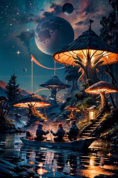 (ultra realistic,32k, masterpiece:1.2),(high detailed:1.1),( high quality:1.1), <lora:Scifi_Environment_Concept_Art:0.8>, sitting, outdoors, multiple boys, sky, 2boys, water, from behind, night, moon, star (sky), night sky, scenery, starry sky, mushroom, crescent moon, boat, fishing rod, fishing, blurry background, <lora:add_detail:0.92>,