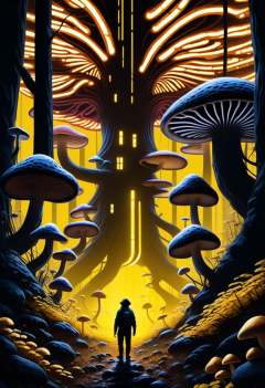 ((masterpiece, best quality)), high resolution, highly detailed, 32k picture,scifi, perfect scifi, yellow glow, stripes, mushroom forest, 1boy, standing, weapon, male focus, outdoors, sky, from behind, tree, night, building, 1other, mushroom, ambiguous gender