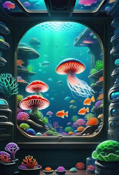 score_9, score_8_up, score_8, zPDXL, BREAK,scifi, indoors, no humans, fish, underwater, mushroom, jellyfish, coral, aquarium, window,