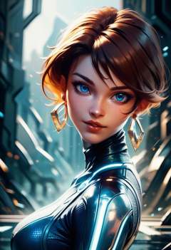score_9, score_8_up, score_8, zPDXL, BREAK,scifi, citronLegacy, 1girl, solo, breasts, looking at viewer, short hair, blue eyes, brown hair, jewelry, medium breasts, earrings, lips, bodysuit, blurry background, freckles
