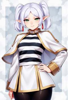 zzCitronCAT, nereirfpnxl, frieren, elf, pointy ears, green eyes, white hair, twintails,shirt, long sleeves, jewelry, earrings, striped, capelet, striped shirt, white skirt, black pantyhose,closed mouth, standing, collarbone, cowboy shot, hand on hip, contrapposto, abstract background,