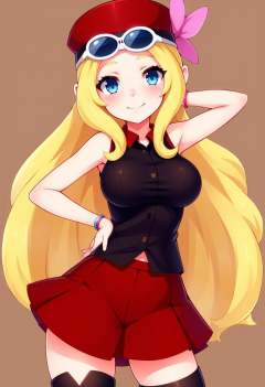 zzCitronCAT, serena (pokemon), 1girl, solo, long hair, breasts, looking at viewer, blush, smile, blue eyes, skirt, blonde hair, shirt, thighhighs, hat, bare shoulders, jewelry, very long hair, closed mouth, standing, collarbone, cowboy shot, pleated skirt, earrings, round perfect breasts, sleeveless, collared shirt, black thighhighs, bracelet, zettai ryouiki, hand on hip, black shirt, sleeveless shirt, red skirt, sunglasses, red headwear, eyewear on head, low-tied long hair, brown background, contrapposto, pink headwear, white-framed eyewear, eyewear on headwear