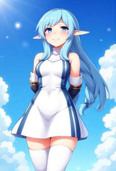 zzCitronCAT, asuna (sao), 1girl, solo, long hair, breasts, looking at viewer, blush, smile, bangs, blue eyes, thighhighs, dress, bare shoulders, medium breasts, very long hair, closed mouth, blue hair, standing, braid, sidelocks, thighs, cowboy shot, detached sleeves, sky, day, pointy ears, striped, cloud, white dress, white thighhighs, blue sky, zettai ryouiki, sparkle, arms behind back, elf, french braid