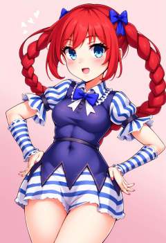 zzCitronCAT, 1girl, solo, long hair, breasts, looking at viewer, blush, smile, open mouth, blue eyes, long sleeves, dress, bow, twintails, medium breasts, short sleeves, hair bow, thighs, red hair, cowboy shot, striped, puffy sleeves, nail polish, twin braids, fingernails, covered navel, blue bow, blue nails, freckles, hands on hips, striped sleeves,