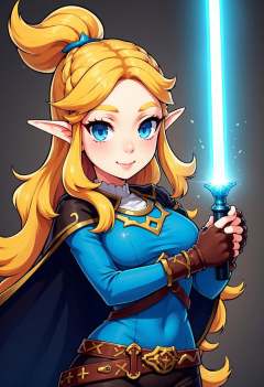 zzCitronCAT, 1girl, solo, long hair, breasts, looking at viewer, smile, blue eyes, blonde hair, hair ornament, gloves, holding, medium breasts, weapon, braid, cowboy shot, pointy ears, hairclip, belt, pants, sword, fingerless gloves, cape, holding weapon, lips, holding sword, black pants, cloak, brown gloves, crown braid, glowing weapon, energy sword, glowing sword, triforce, lightsaber, princess zelda, zzLightSaber, white lightsaber