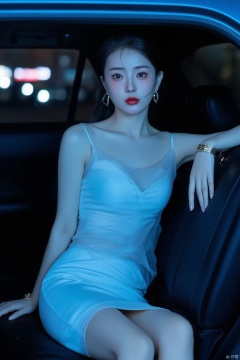 1girl,seated in the backseat of a car. She has fair skin, long black hair tied in a low ponytail, and striking red lipstick. She is wearing a sleeveless, light blue, form-fitting dress with thin straps and a high neckline, which accentuates her slender physique and small to medium-sized breasts. The dress is made of a sheer, light blue fabric that flows down to her knees, revealing her bare legs. She accessorizes with large, gold hoop earrings and a matching gold bracelet on her left wrist. Her pose is relaxed yet elegant; she is sitting with her legs crossed and her right arm resting on the backseat, while her left arm is placed on her lap. The interior of the car is dark, with a blue tint to the light, creating a moody, introspective atmosphere. The car’s black leather seats and door are visible, along with a hint of the outside world through the car windows, where blurred bokeh lights suggest a nighttime urban setting. The overall composition and color palette evoke a sense of calm and sophistication, with the subject's serene expression adding to the contemplative mood of the photograph.