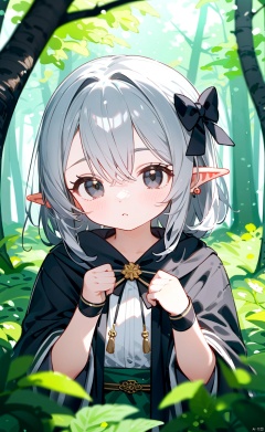 masterpiece, 8k,best quality,loli, sharp Ears, (solo), gray Hair,black eyes,kawaii, (depth of Field), bowknot, forest,mage robe,