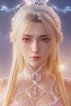 1girl,Bangs, off shoulder, colorful_hair, ((colorful hair)),golden dress, yellow eyes, chest, necklace, pink dress, earrings, floating hair, jewelry, sleeveless, very long hair,Looking at the observer, parted lips, pierced,energy,electricity,magic,tifa,sssr,blonde hair,jujingyi, wangyushan, dofas, forehead mark, (\yan yu\), qingyi,Xluxueqi