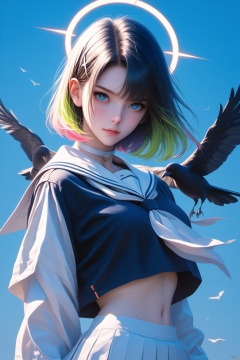 score_9,score_8_up,score_7_up,1girl,bird,halo,bottomless,solo,hair ornament,hair over one eye,sailor collar,navel,blue eyes,white sailor collar,black hair,shirt,gradient,long sleeves,multicolored hair,x hair ornament,school uniform,short hair,looking at viewer,gradient background,serafuku,white neckerchief,convenient censoring,closed mouth,holding,choker,blue background,colored inner hair,cowboy shot,bangs,blue shirt,neckerchief,white choker,crow,