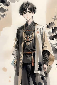 1boy,20 years old,full body,detailed,(looking at viewer:0.9),<lora:IllustrationInk-0010:0.8>,moran,ink painting,