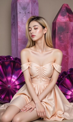 "The image features a young woman elegantly dressed in a peach-colored dress, surrounded by large, vividly colored crystals which vary in shades of purple and pink. She is seen sitting with a serene expression, her eyes gently closed, suggesting a moment of peaceful contemplation or reverie. Her long, flowing blonde hair and the soft, ruffled texture of her dress add a touch of grace and tenderness to the scene. The juxtaposition of the soft fabric against the sharp, natural geometry of the crystals creates a compelling contrast, emphasizing themes of beauty and tranquility amidst a fantastical setting. The overall ambiance is dreamlike and ethereal, with a predominant color palette of soft peach and various shades of purple and pink."